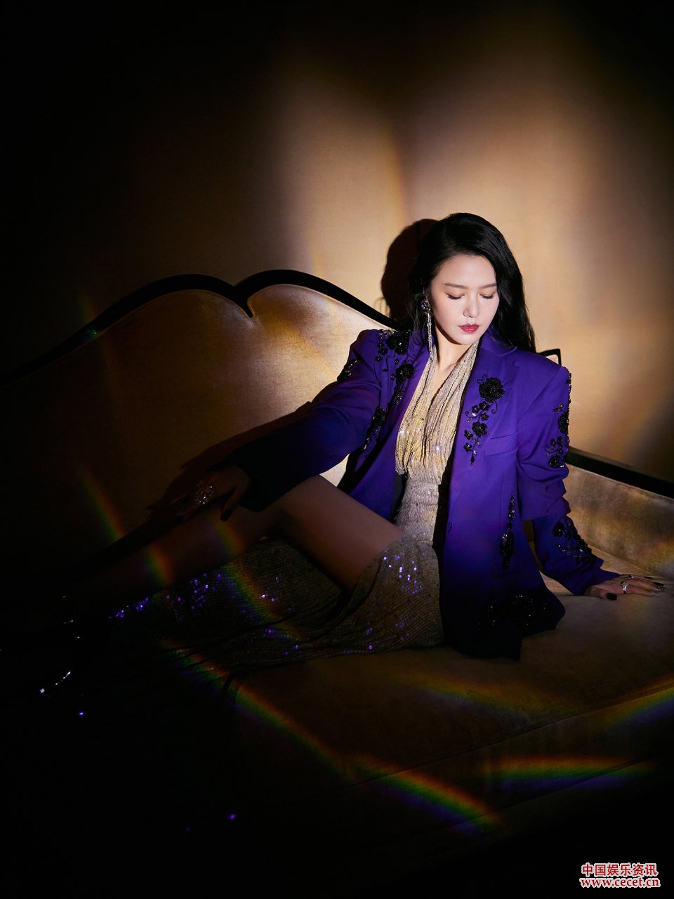 譚維維柔軟長(cháng)裙外搭紫色外套釋放美艷氣質(zhì)