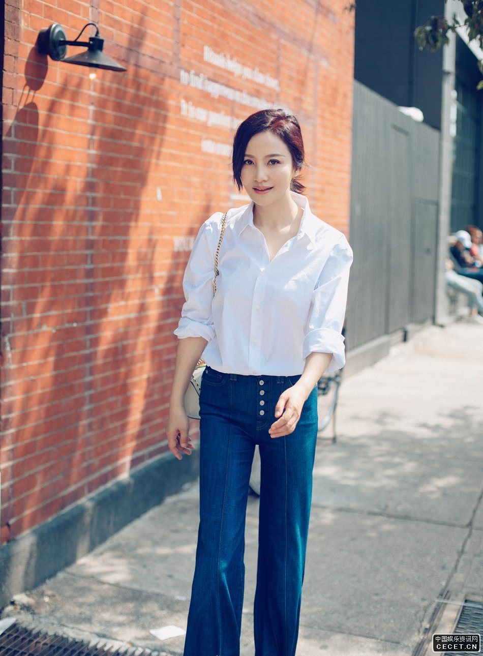 陶紅白襯衫搭配牛仔褲 輕松打造出完美比例