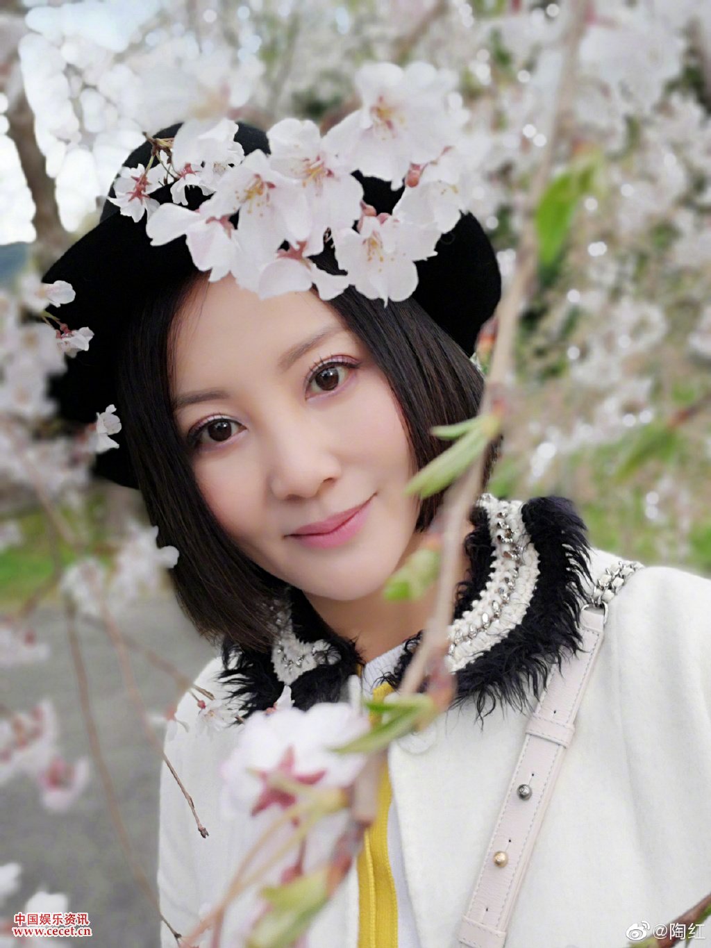 陶紅美照嘟嘴俏皮可愛(ài) 沉醉在花花的世界里