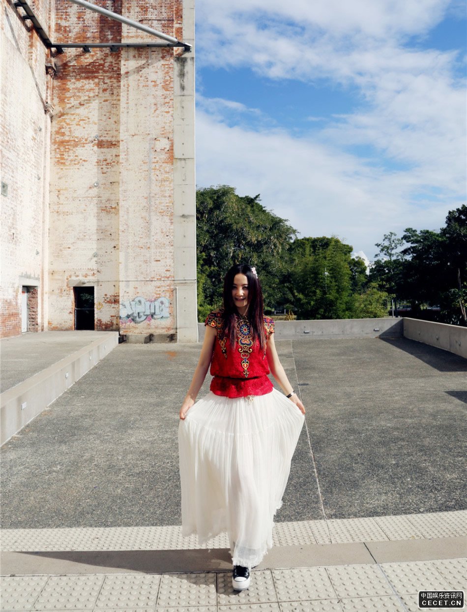 大陶紅國外度假拍寫(xiě)真 中國風(fēng)刺繡紅上衣