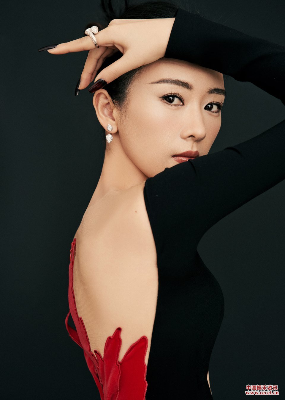 童瑤一身紅花拖尾黑裙 背后紅花綻放光彩