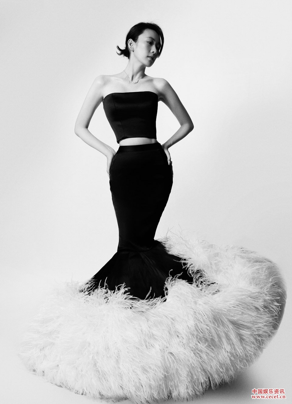 童瑤黑色緞面浪花人魚(yú)裙 裙底白色羽毛搖曳生姿