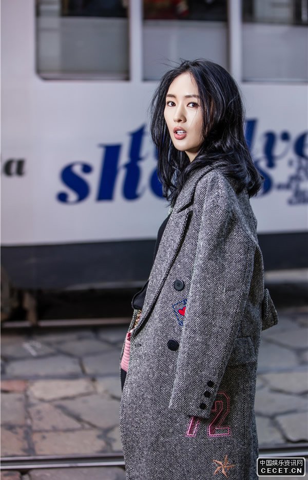 童瑤帥氣中性街拍大片 灰色系大衣皮U半裙