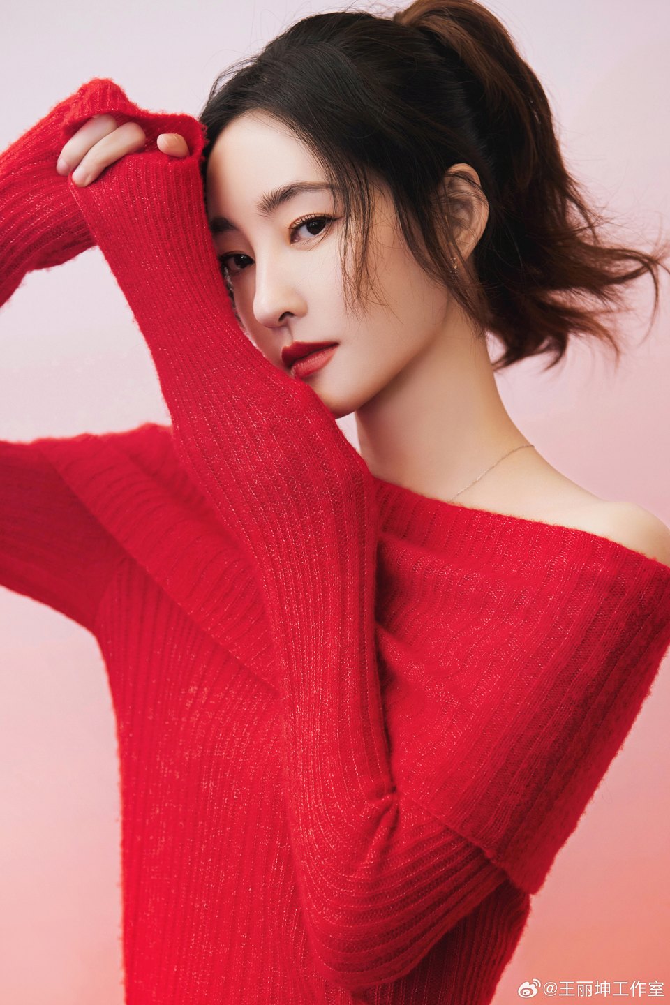 王麗坤紅色齊肩毛織衫 鎖骨線(xiàn)條精致溫婉迷人