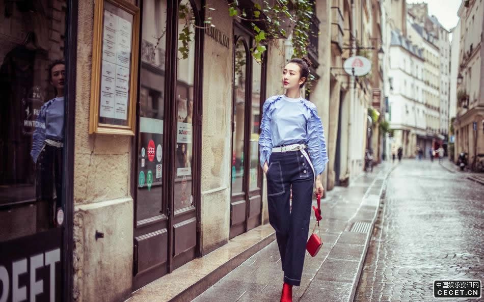 王鷗早春街拍清新柔美 圓領(lǐng)襯衣高腰牛仔褲
