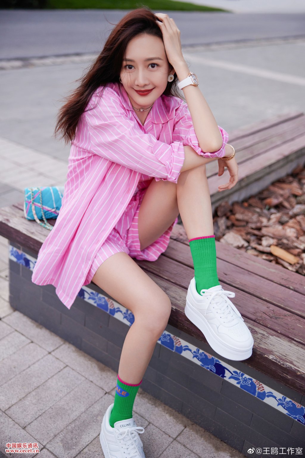 王鷗粉色襯衫搭配同色短褲景區游玩活力滿(mǎn)滿(mǎn)