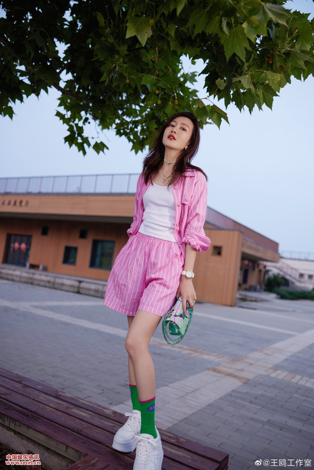 王鷗粉色襯衫搭配同色短褲景區游玩活力滿(mǎn)滿(mǎn)