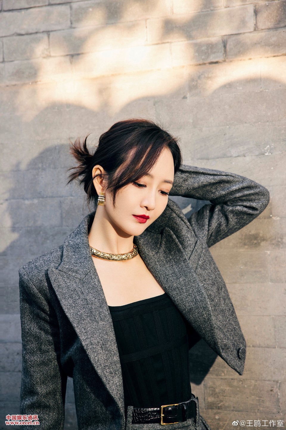 王鷗灰色套裝戶(hù)外游走 感知生活的溫柔與愜意