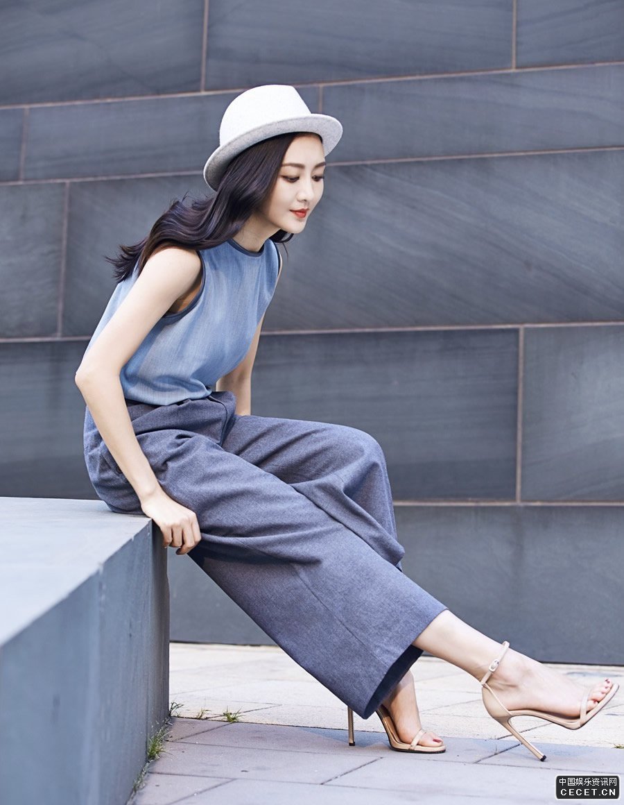 王鷗曝光街拍大片 藍色上衣搭配深藍色闊腿褲