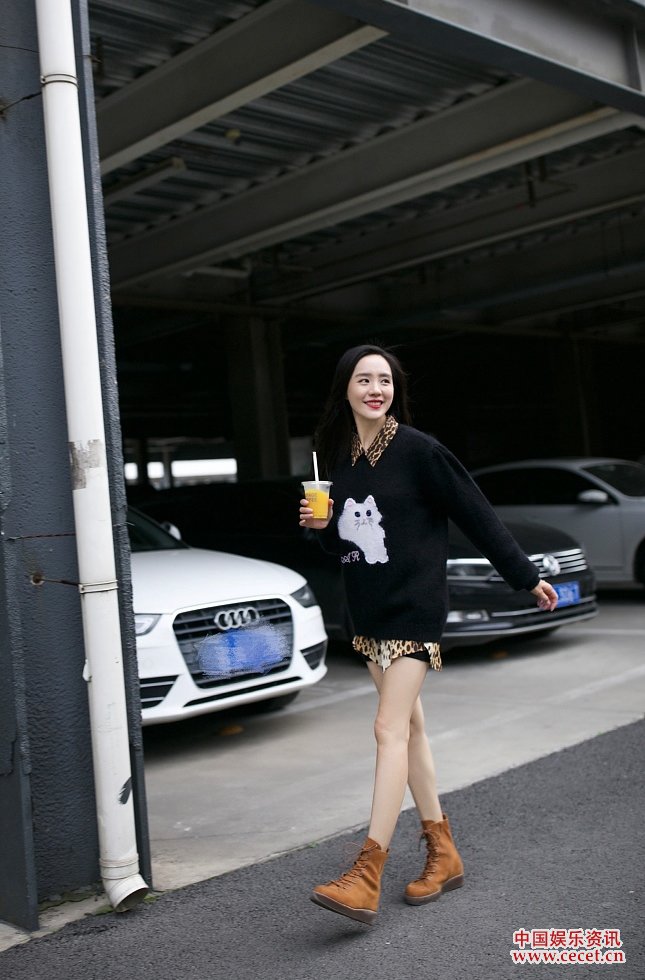 王智私服街拍隨性愜意 黑色毛衣內搭豹紋襯衣
