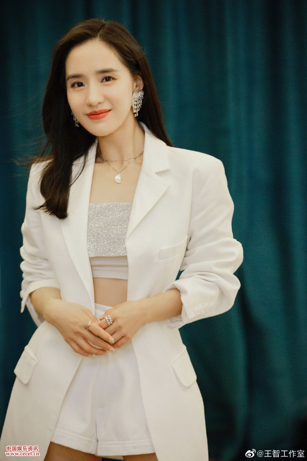 王智白色西裝高腰短褲亮鉆抹胸甜颯范兒好正