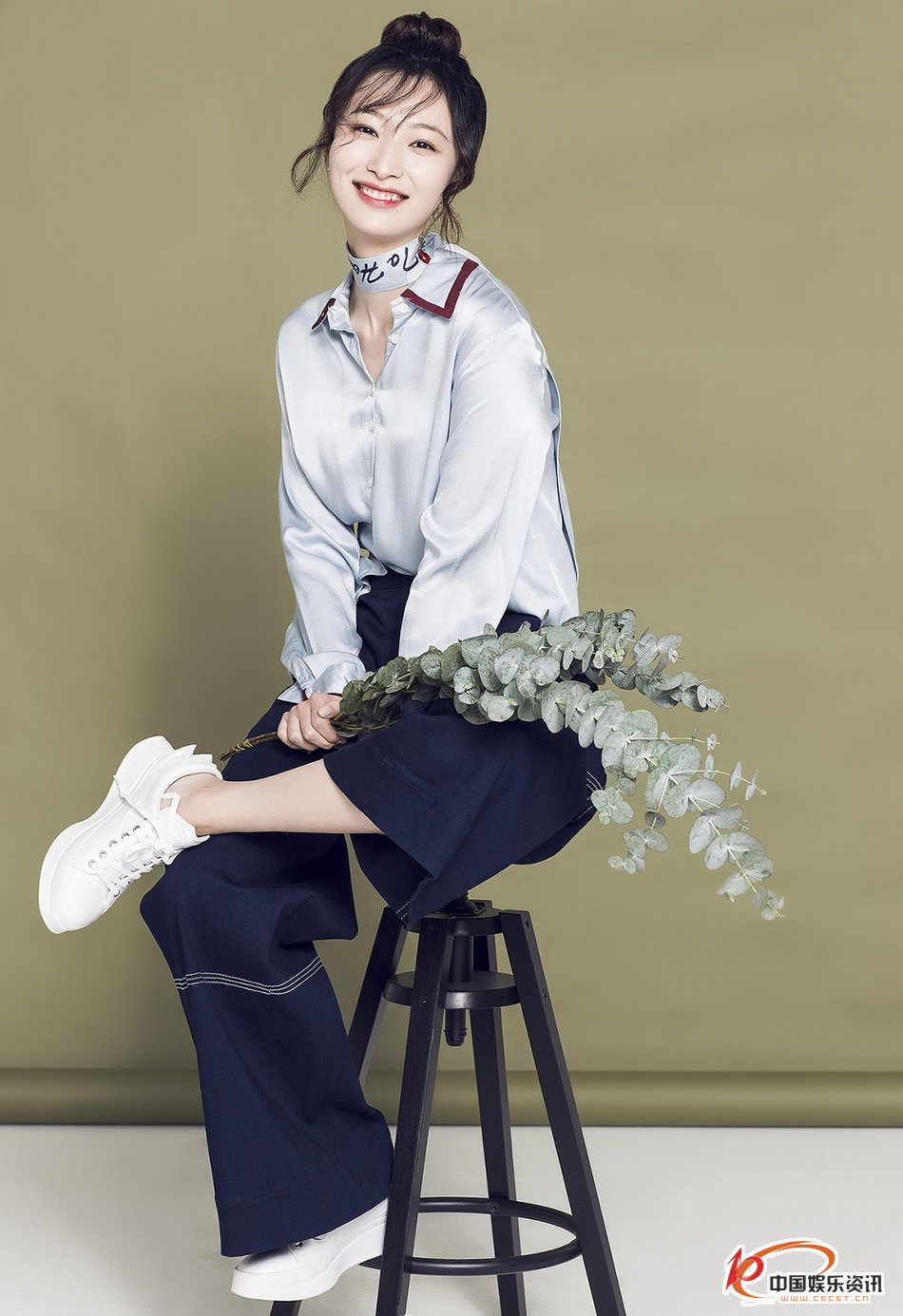 王梓桐文藝范寫(xiě)真 藏青色闊腿高腰褲清新靚麗