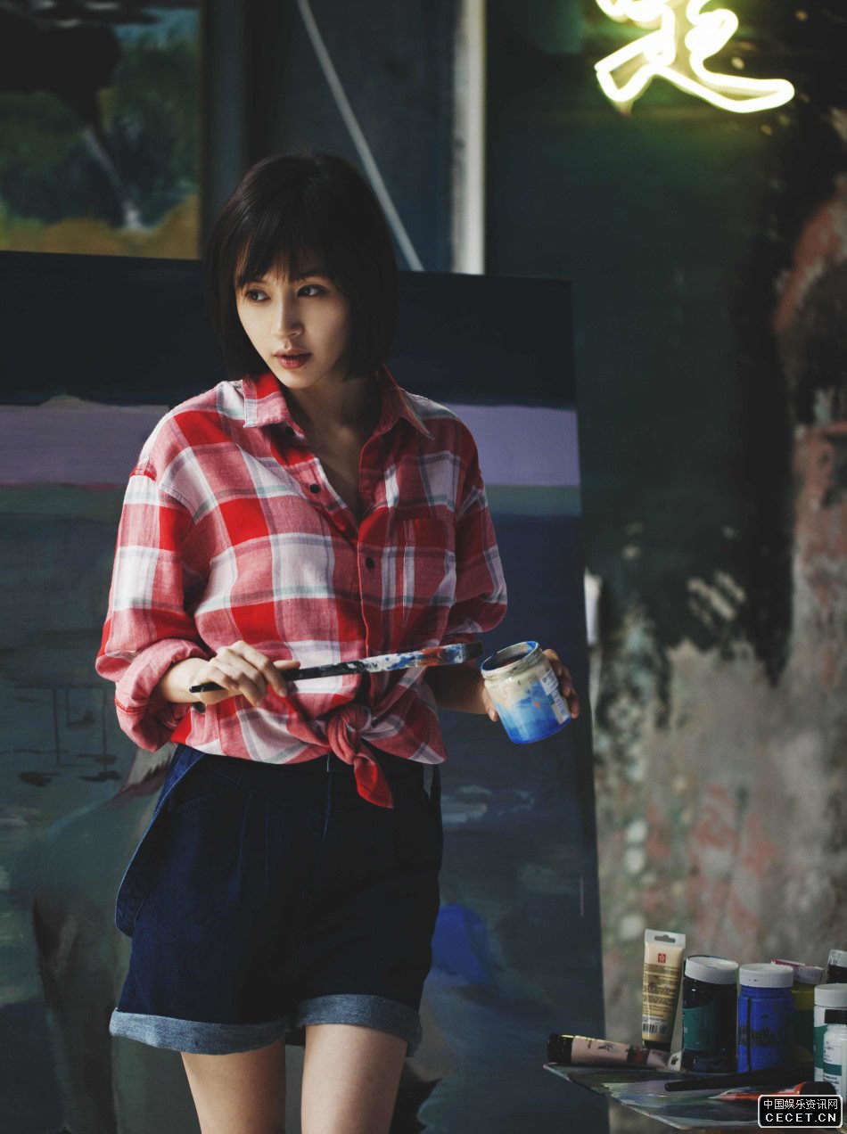 王子文藝術(shù)氣息寫(xiě)真 紅格紋襯衫深藍工裝短褲