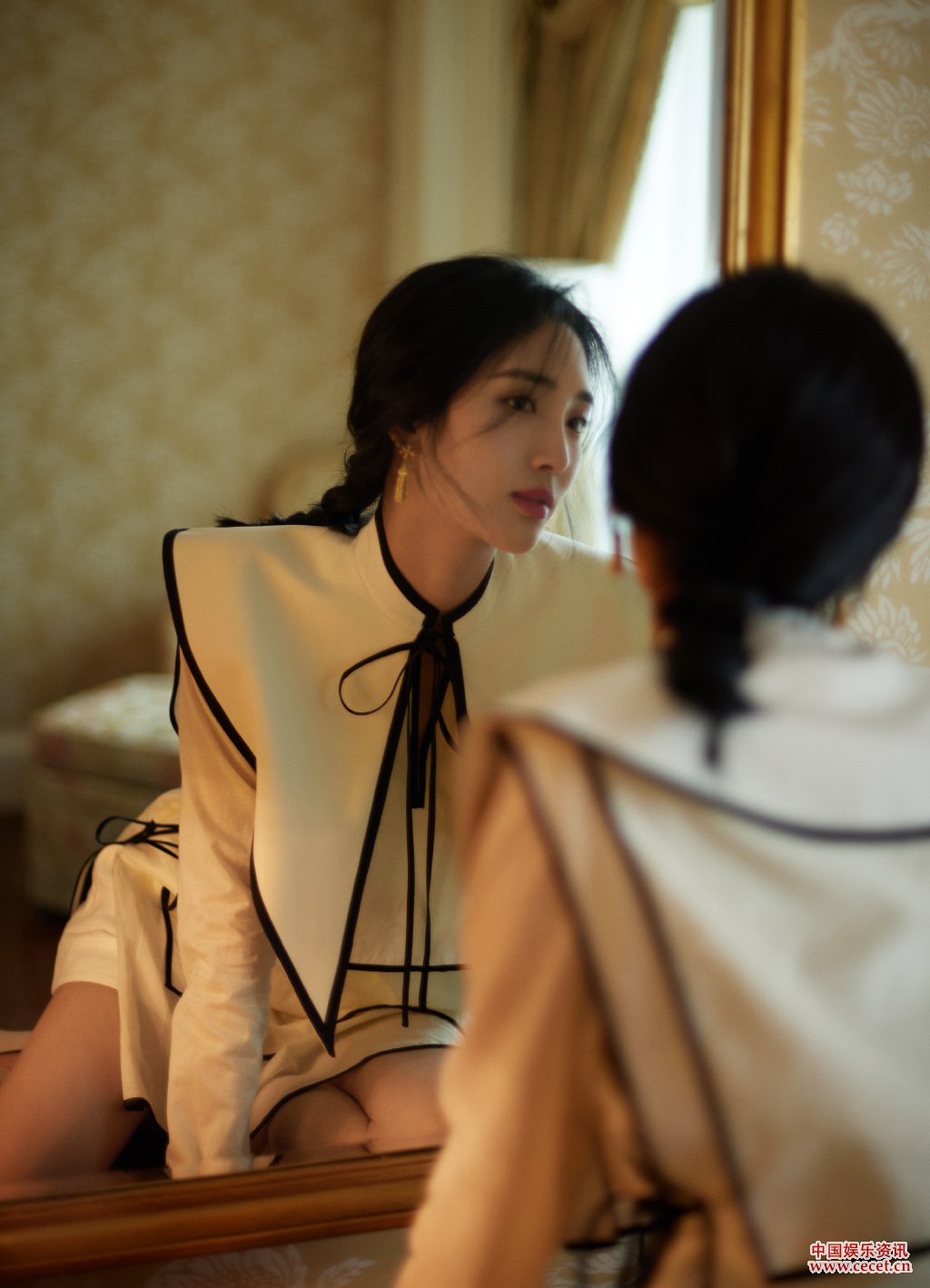 王紫璇珍珠白薄紗長(cháng)袍 暖調光影展現清靈美感