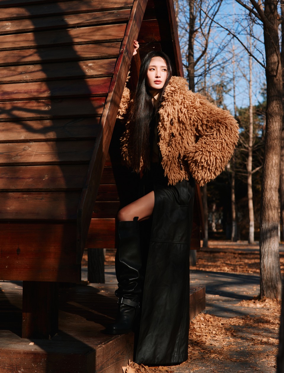 王紫璇戶(hù)外毛絨披肩 落葉和降溫暖意融融