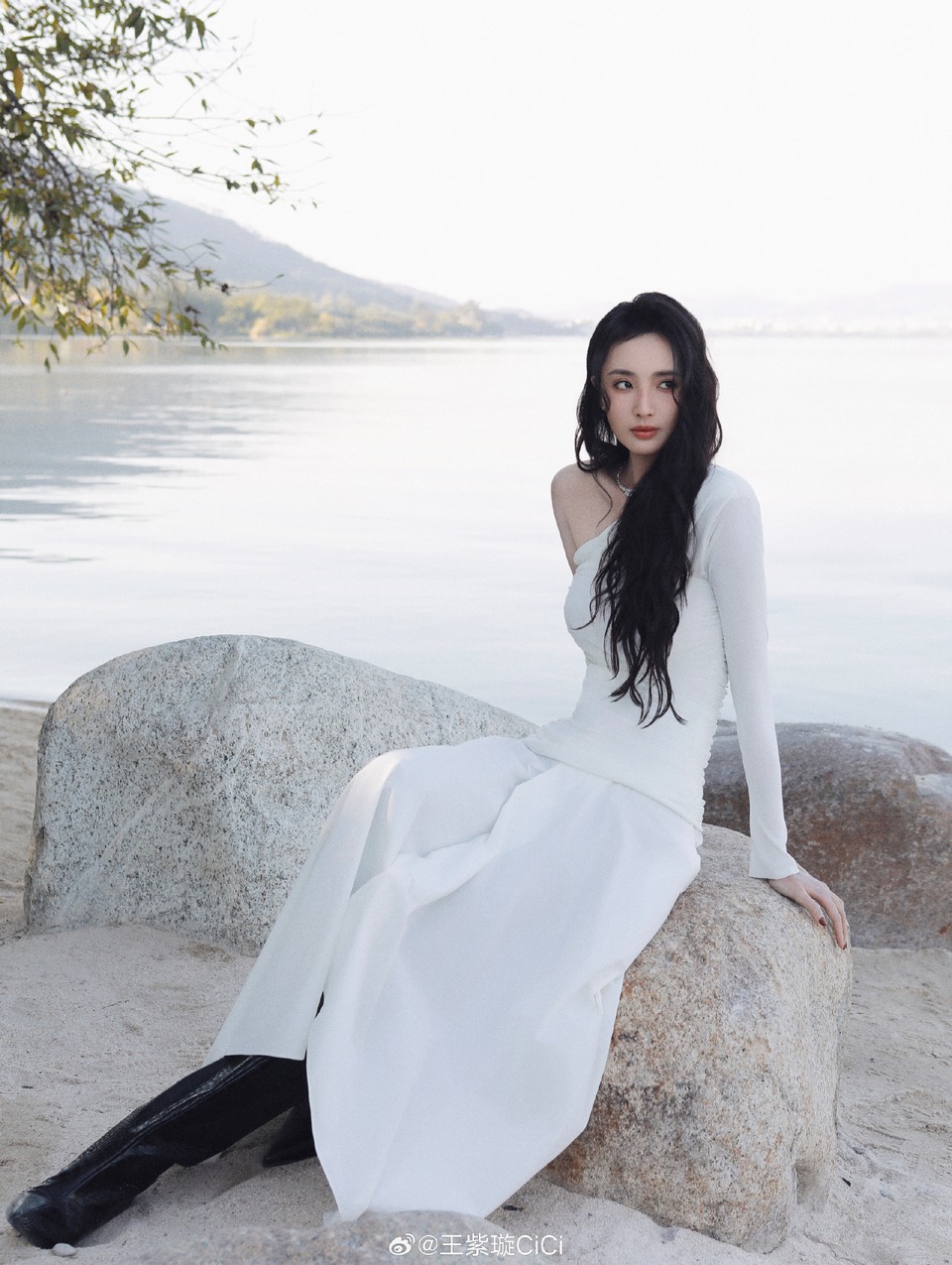 王紫璇白色衣裙湖邊照 舉手投足間盡顯精致女人范