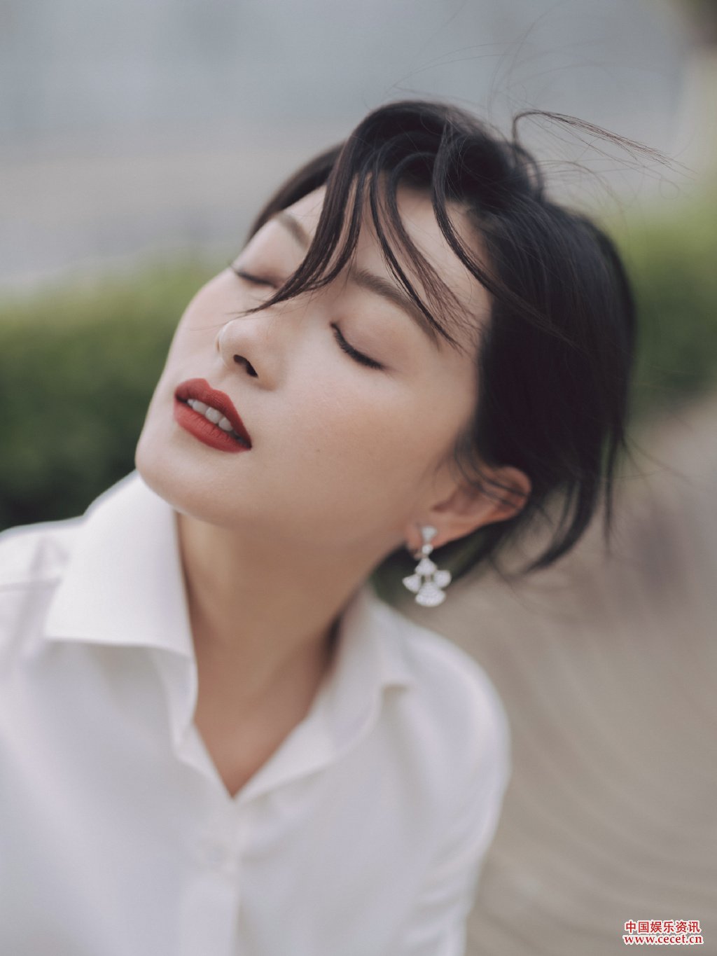 萬(wàn)茜身著(zhù)白色襯衫搭配金色蓬蓬半裙側顏精致