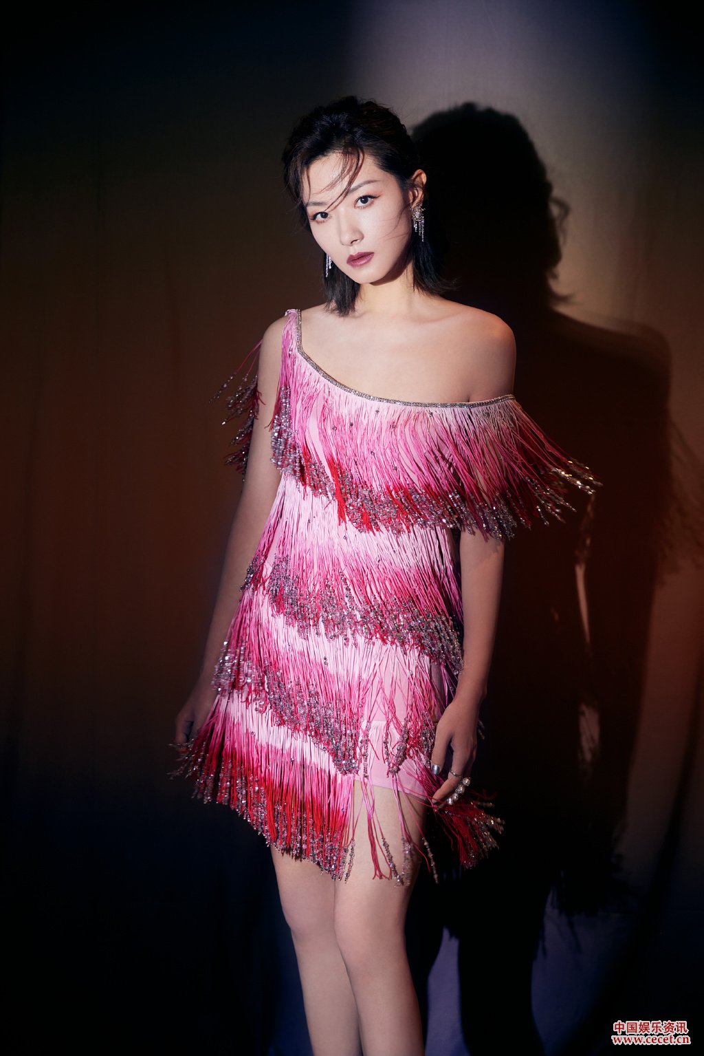 萬(wàn)茜粉紅流蘇短裙美照 精致鎖骨白皙迷人