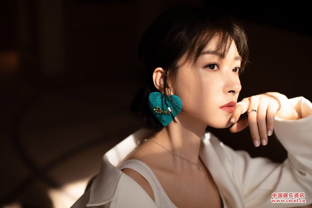 萬(wàn)茜白色套裝搭配綠色心形耳飾用光影勾勒優(yōu)雅