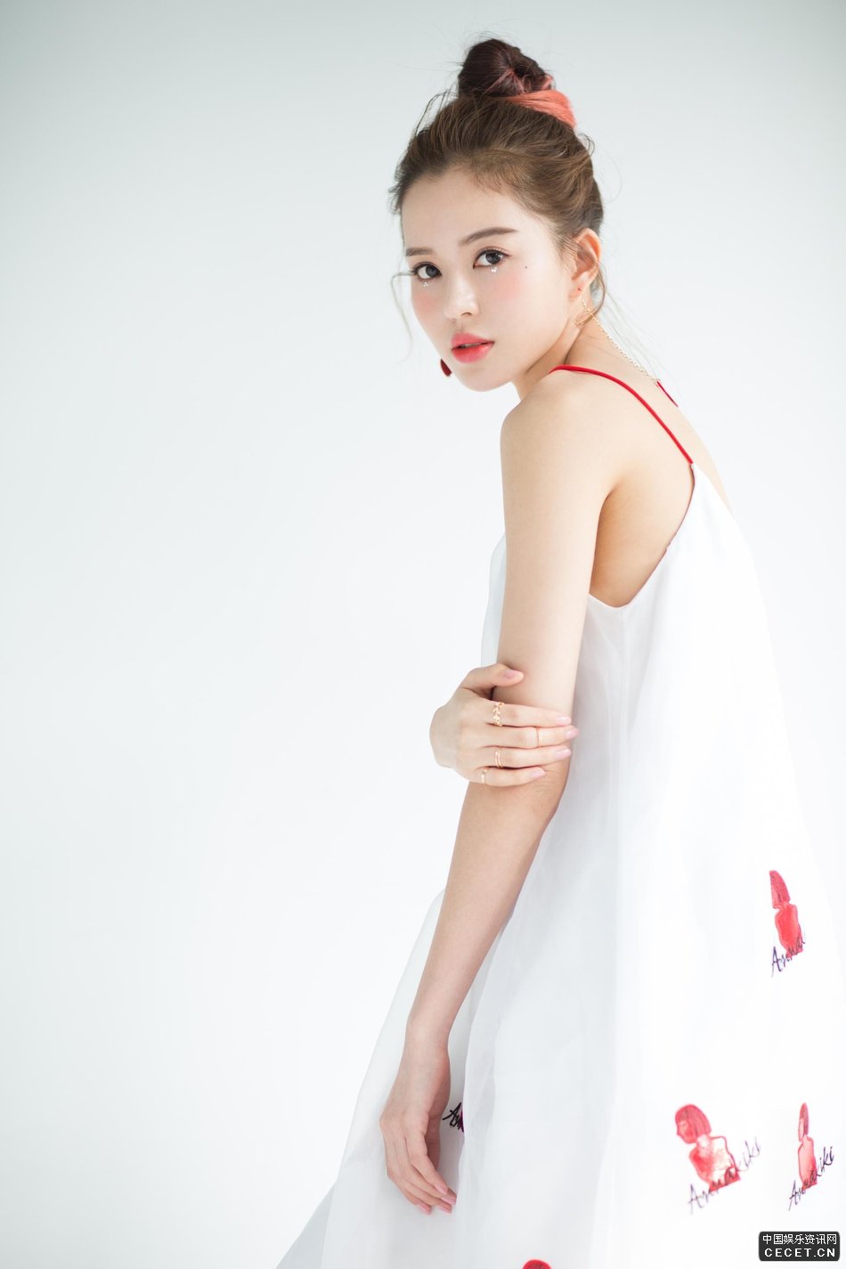 溫心印花連衣裙寫(xiě)真 白色V領(lǐng)露出漂亮的鎖骨