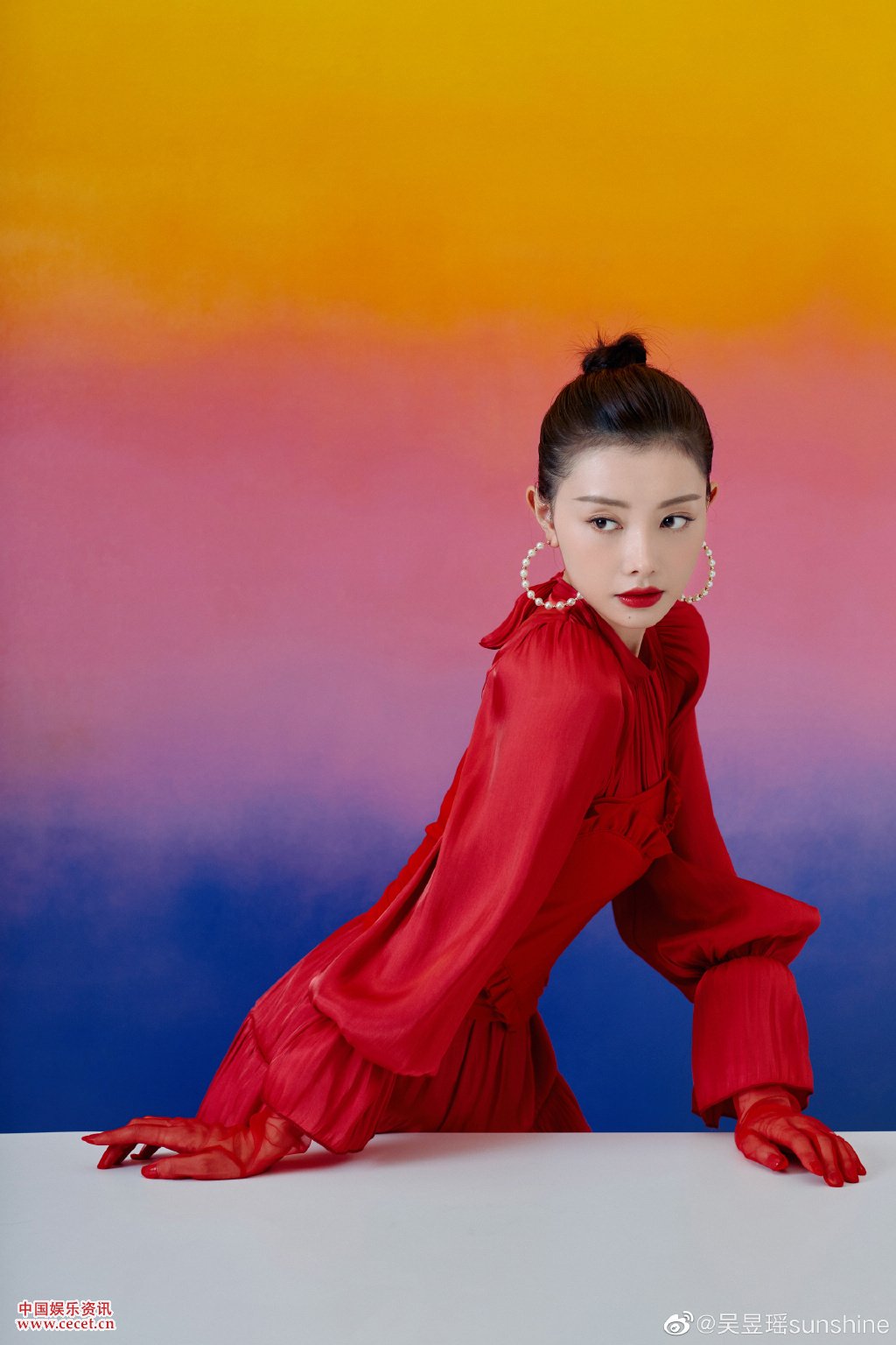 吳昱瑤大紅寫(xiě)真 扎著(zhù)丸子頭配紅唇優(yōu)雅十足