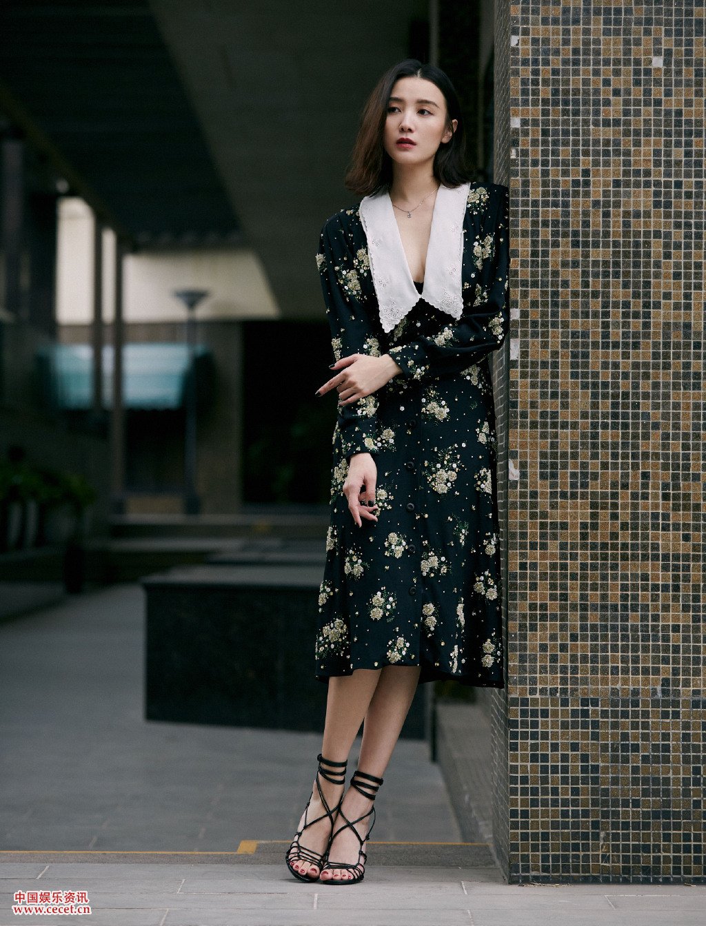 宋佳羊腿袖釘珠連衣裙搭配荷葉邊領(lǐng)又不失俏皮