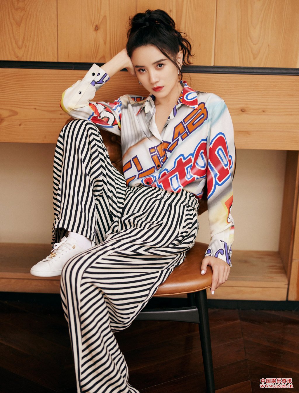 宋佳一襲印花襯衫搭配黑白條紋闊腿褲摩登明麗