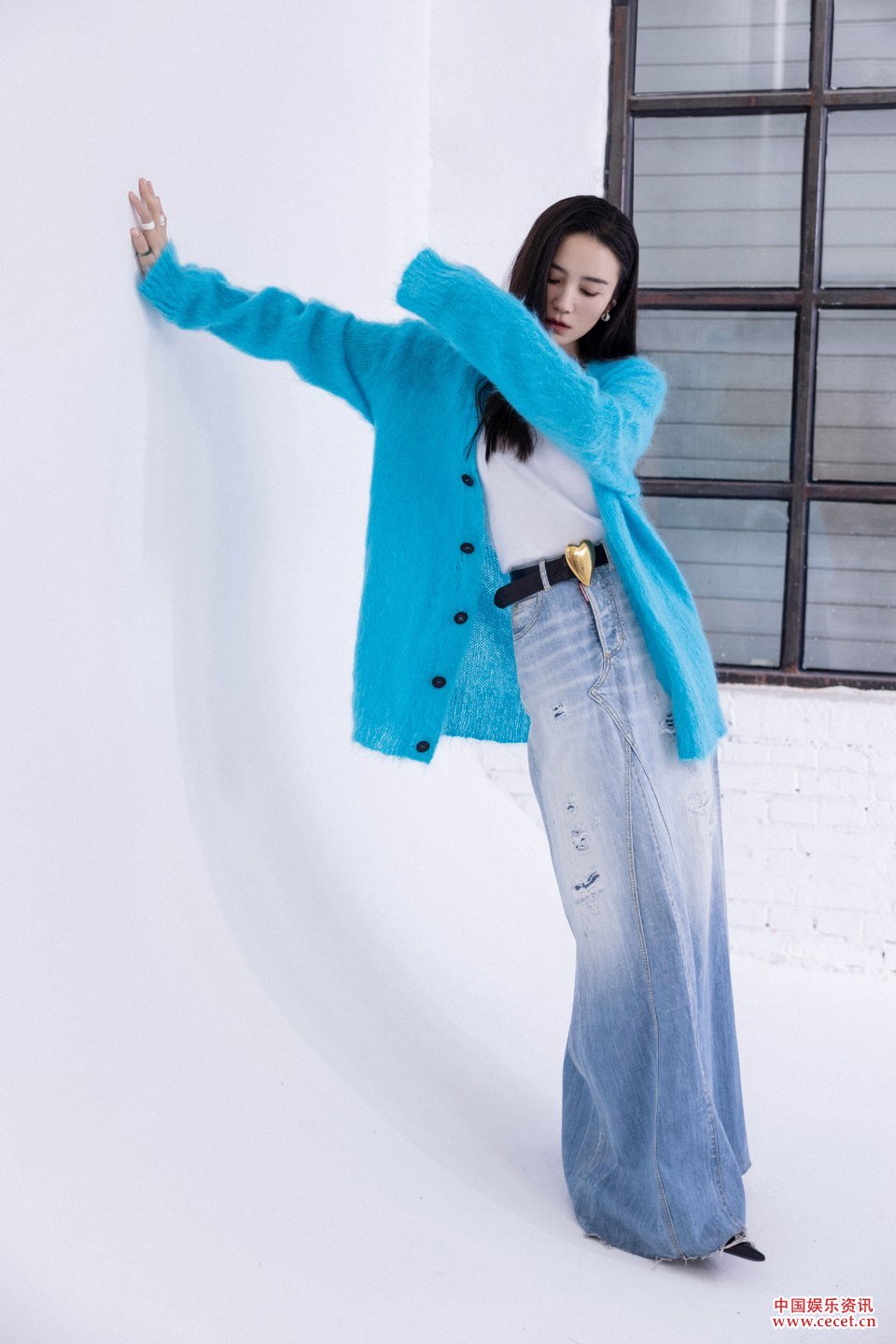 宋佳藍色毛衫牛仔長(cháng)裙 造型溫婉清爽迷人