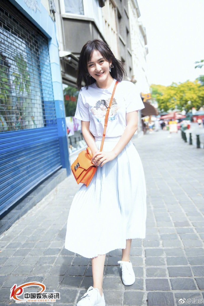 謝娜白衣白裙清爽可人 笑容明媚在街頭徜徉