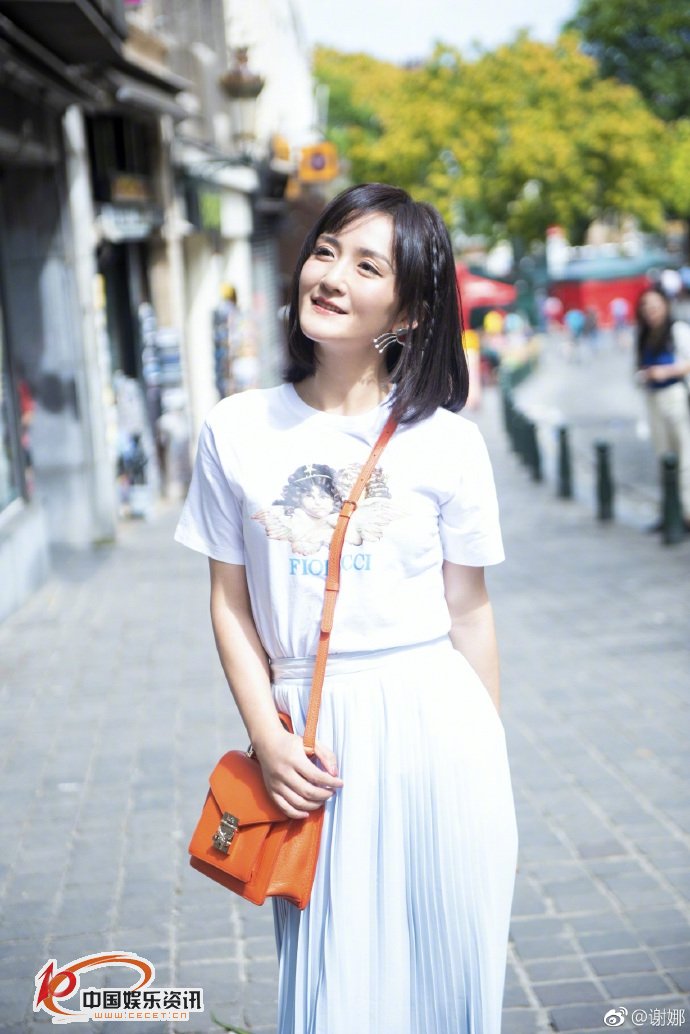 謝娜白衣白裙清爽可人 笑容明媚在街頭徜徉