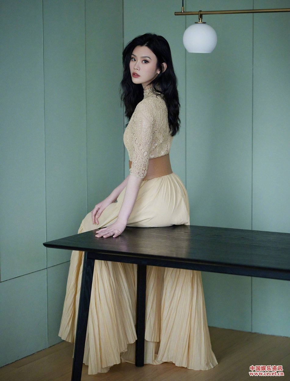 奚夢(mèng)瑤米色蕾絲長(cháng)裙 眼神嫵媚撩人超模氣場(chǎng)不減