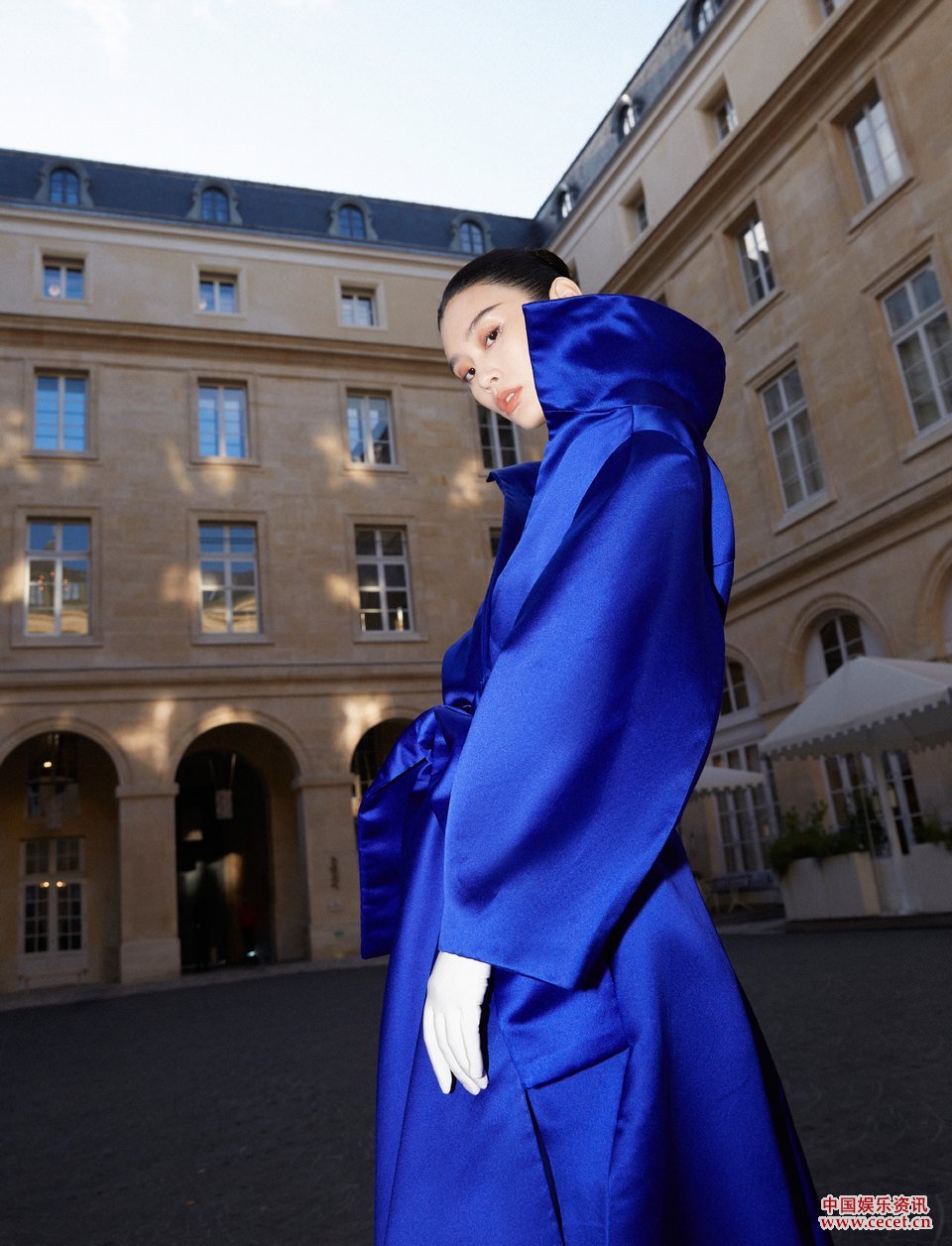 奚夢(mèng)瑤身著(zhù)電藍色外套連衣裙 前衛不失優(yōu)雅