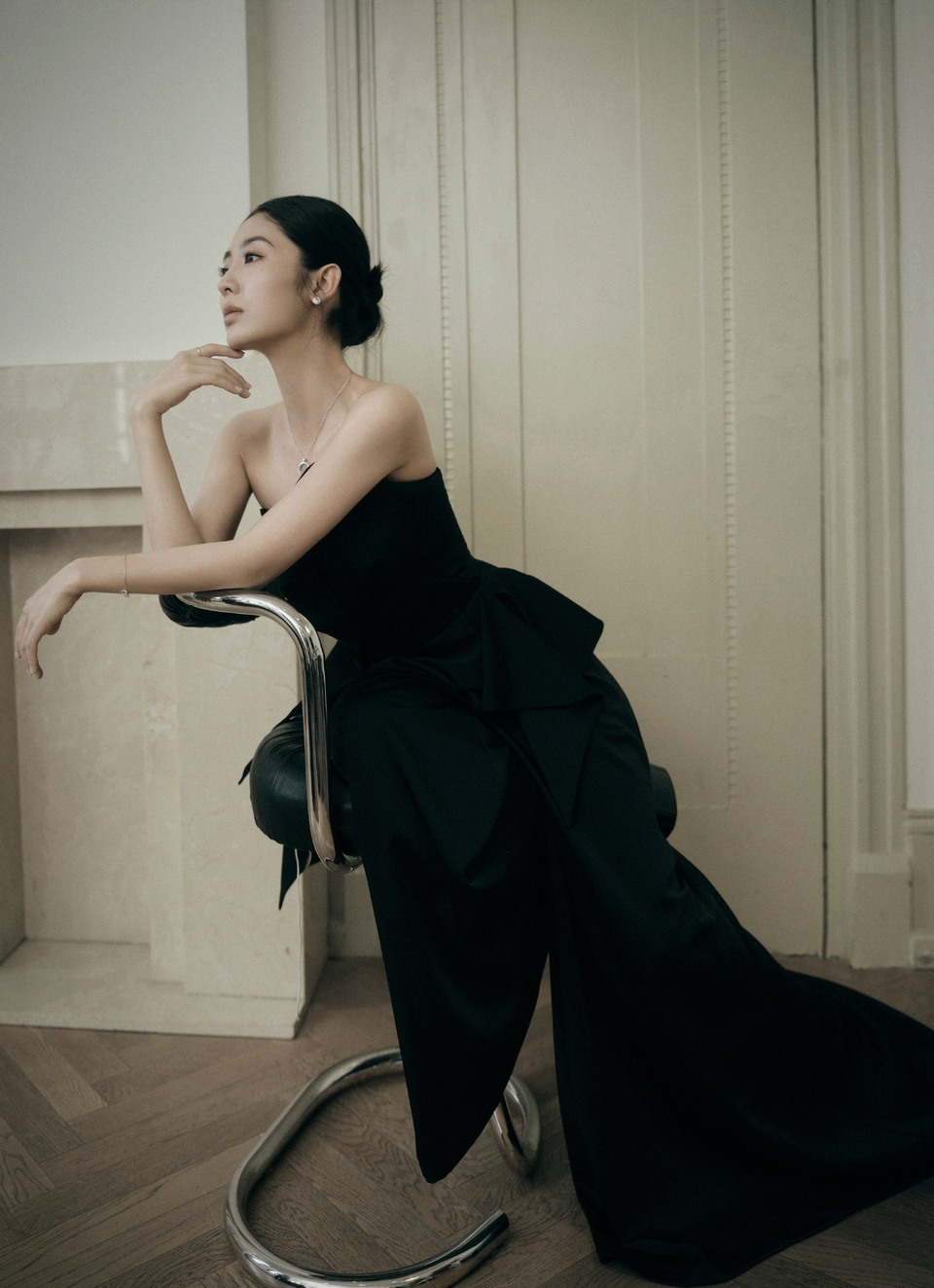 邢菲盤(pán)發(fā)抹胸黑裙冷御清雅 風(fēng)格自成勾勒不拘之美