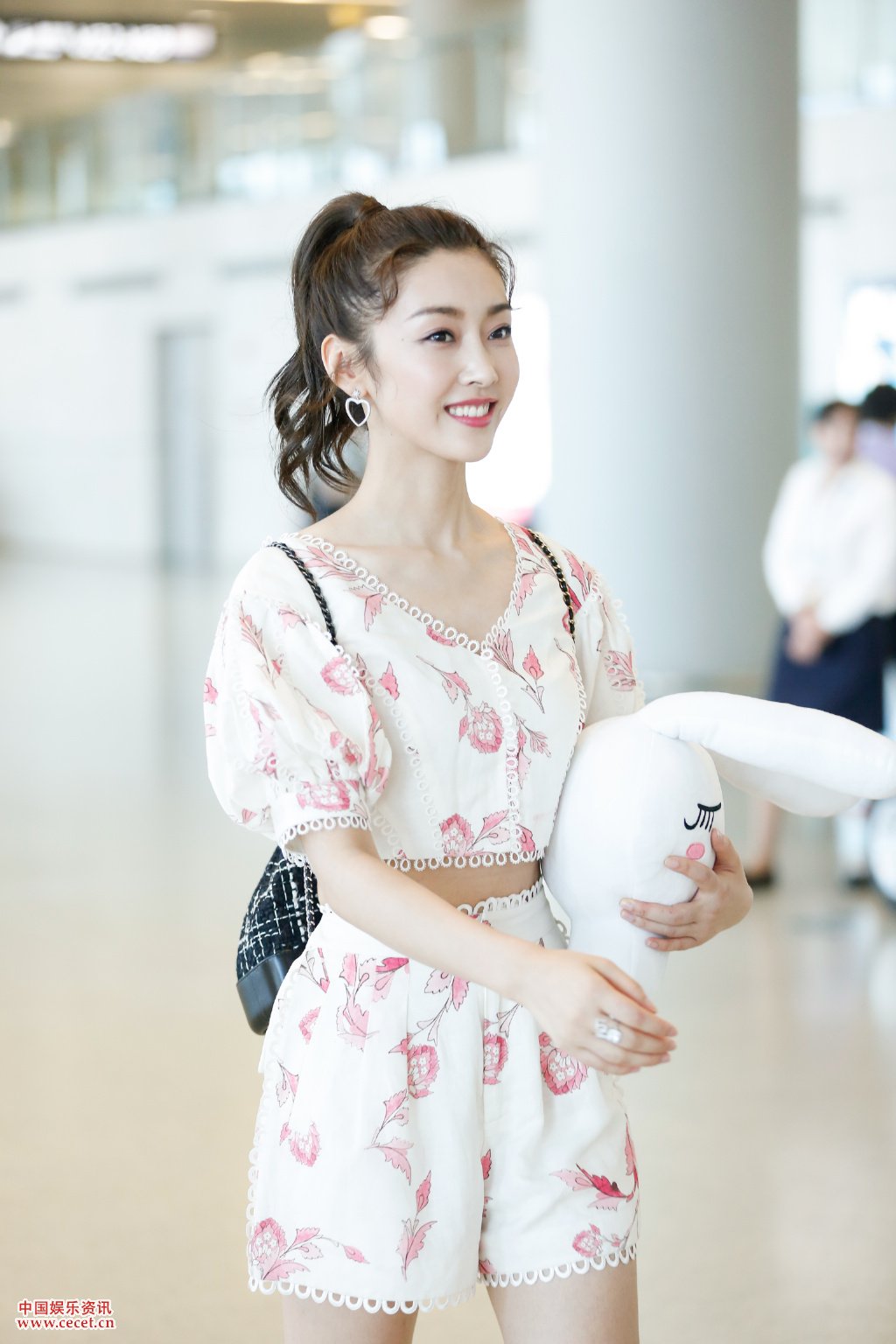 宣璐白色印花V領(lǐng)泡泡袖上衣高腰短褲清新靚麗