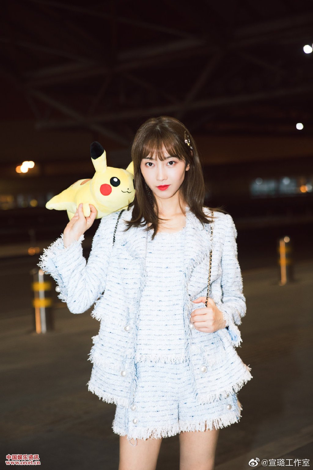 宣璐手拿超萌皮卡丘玩偶 藍色清爽look現身