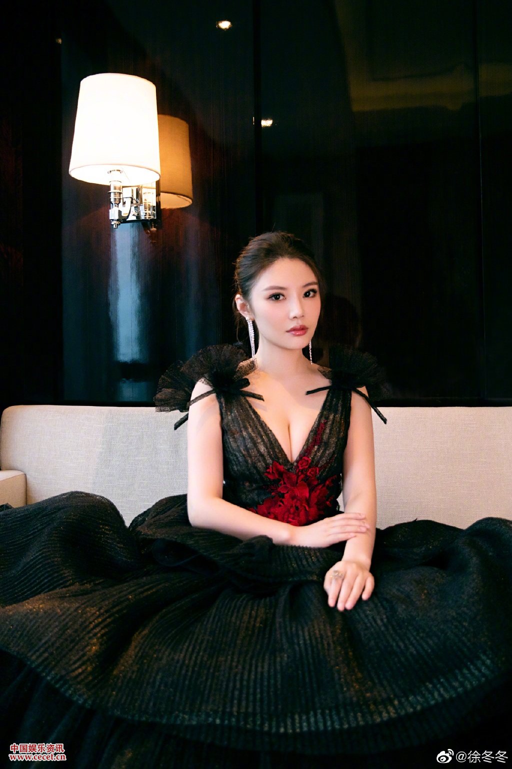 徐冬冬大裙擺凸顯腰身 深咖啡色配上火紅玫瑰