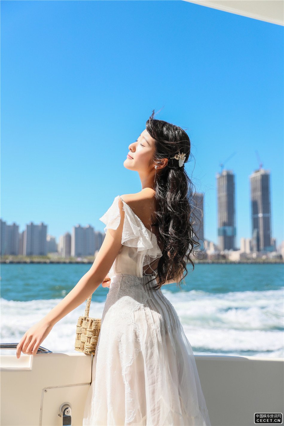 徐嬌白裙薄紗輕盈飄逸 身姿宛如海上仙子