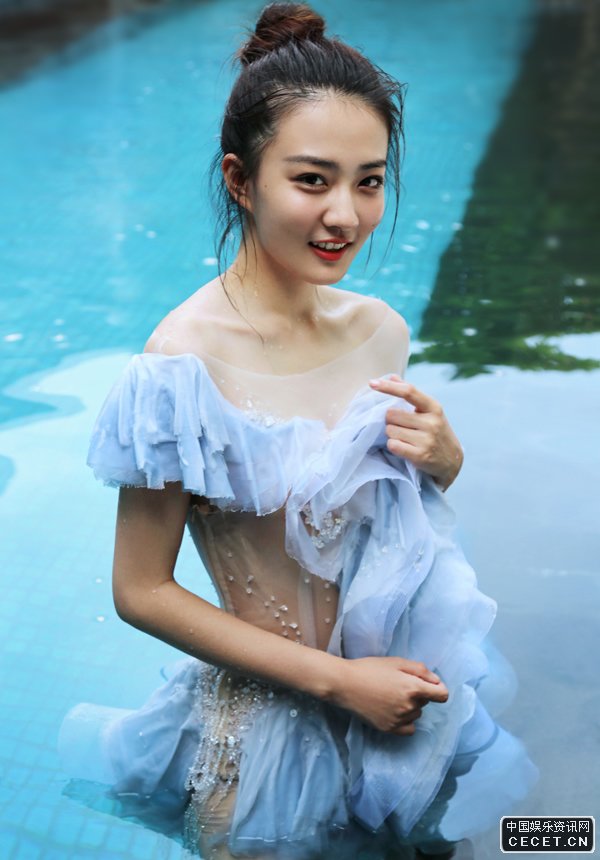 徐璐身著(zhù)薄如蟬翼輕盈飄逸的水藍色紗衣