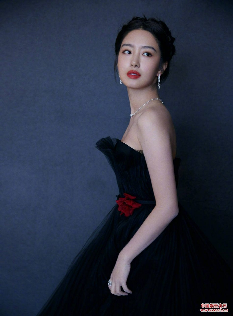 楊采鈺黑色玫瑰紗裙照 精致紅唇美妝十分優(yōu)雅