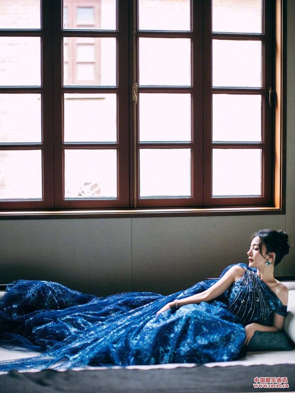 楊冪拖尾星空藍裙溫婉靈動(dòng) 慵懶又不失嫵媚