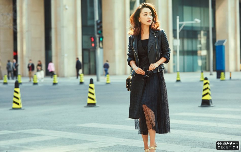 楊蓉酷感黑色系街拍 紅唇凝脂拼接紗質(zhì)連衣裙