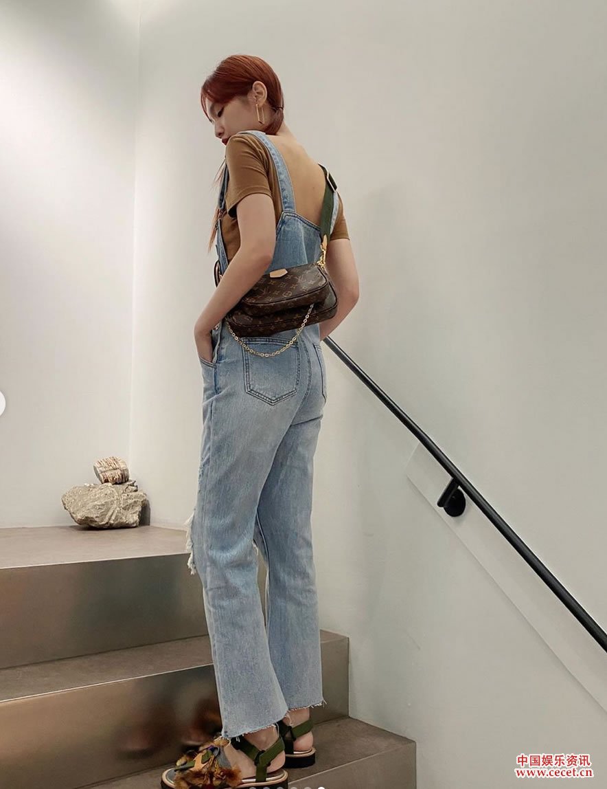 楊丞琳破洞牛仔背帶褲在樓梯間擺POSE可愛(ài)減齡