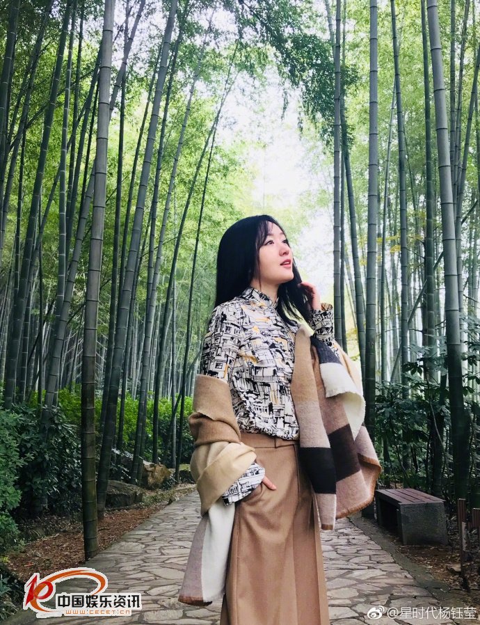 楊鈺瑩竹林中仰頭拍照 側顏溫柔甜笑動(dòng)人