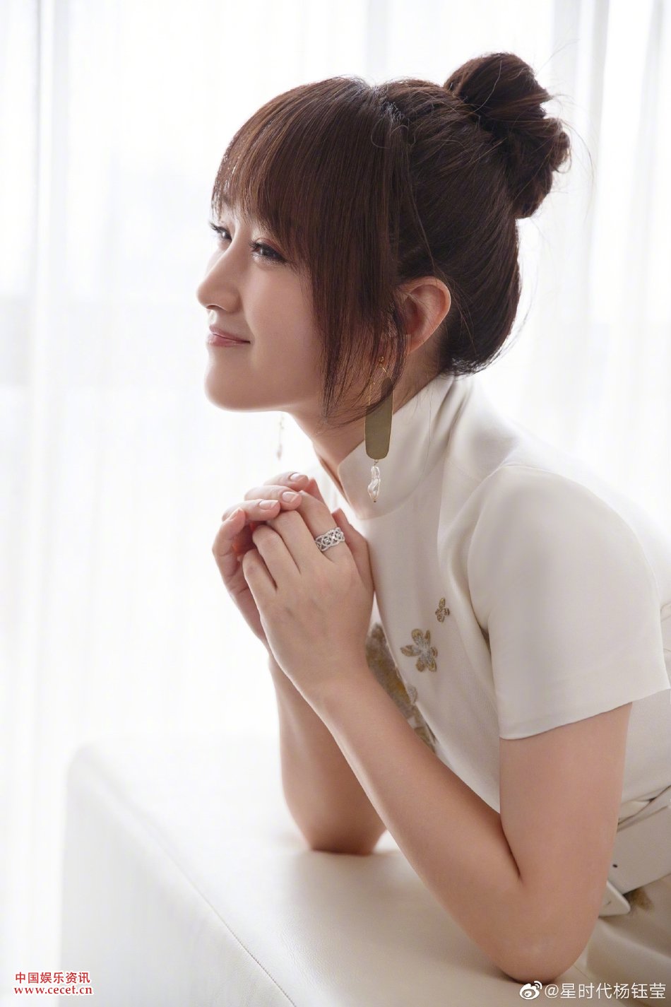 楊鈺瑩白色刺繡長(cháng)裙 低頭淺笑氣質(zhì)十分優(yōu)雅
