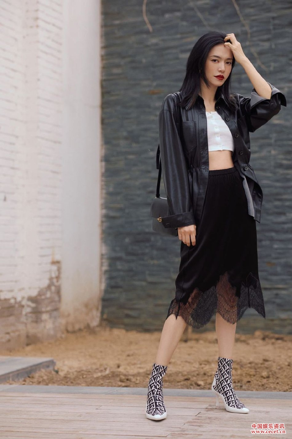 姚晨皮衣蕾絲半裙街拍 小露蠻腰十分性感時(shí)髦