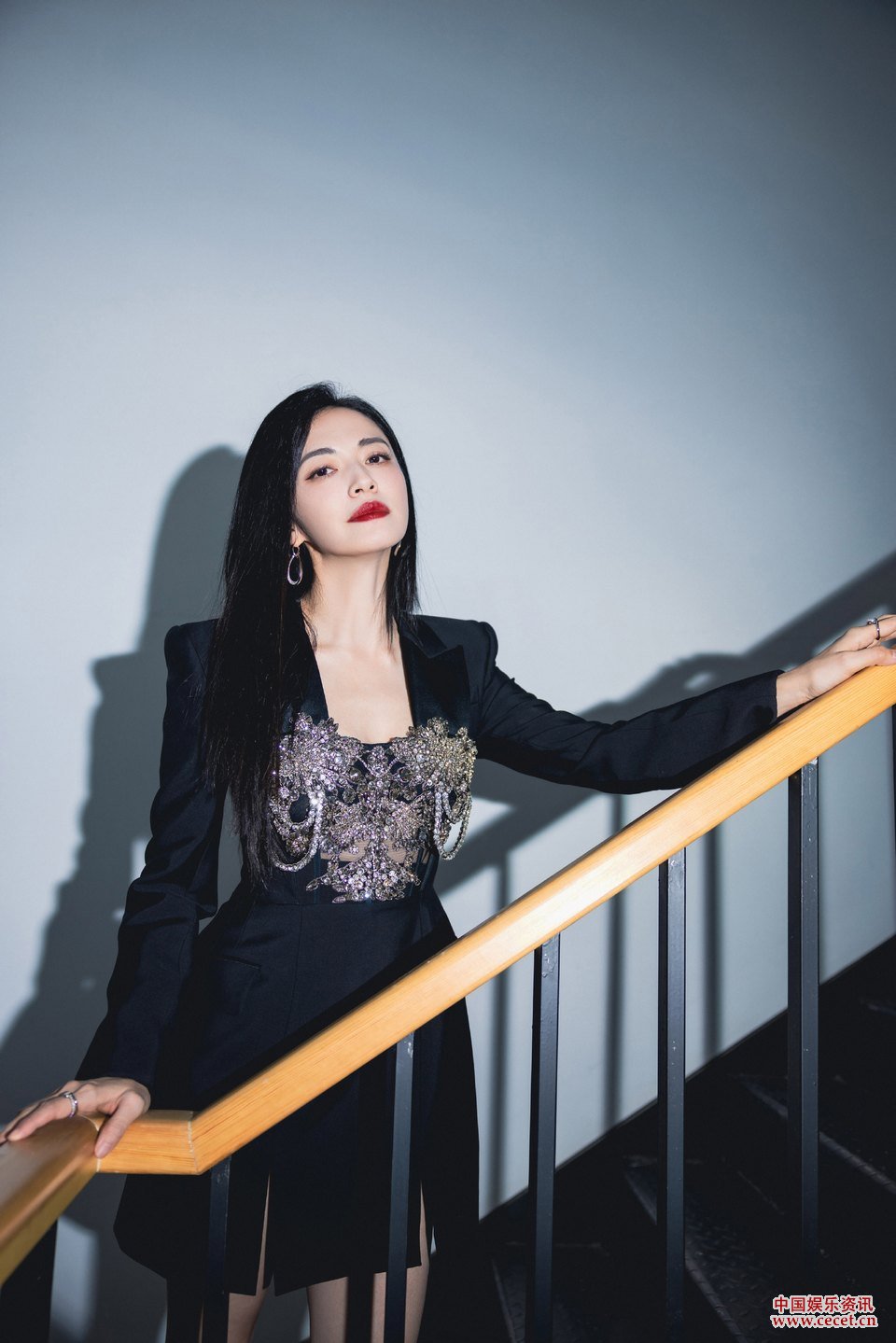 姚晨一襲黑色束腰裙裝于靜謐之間彰顯利落