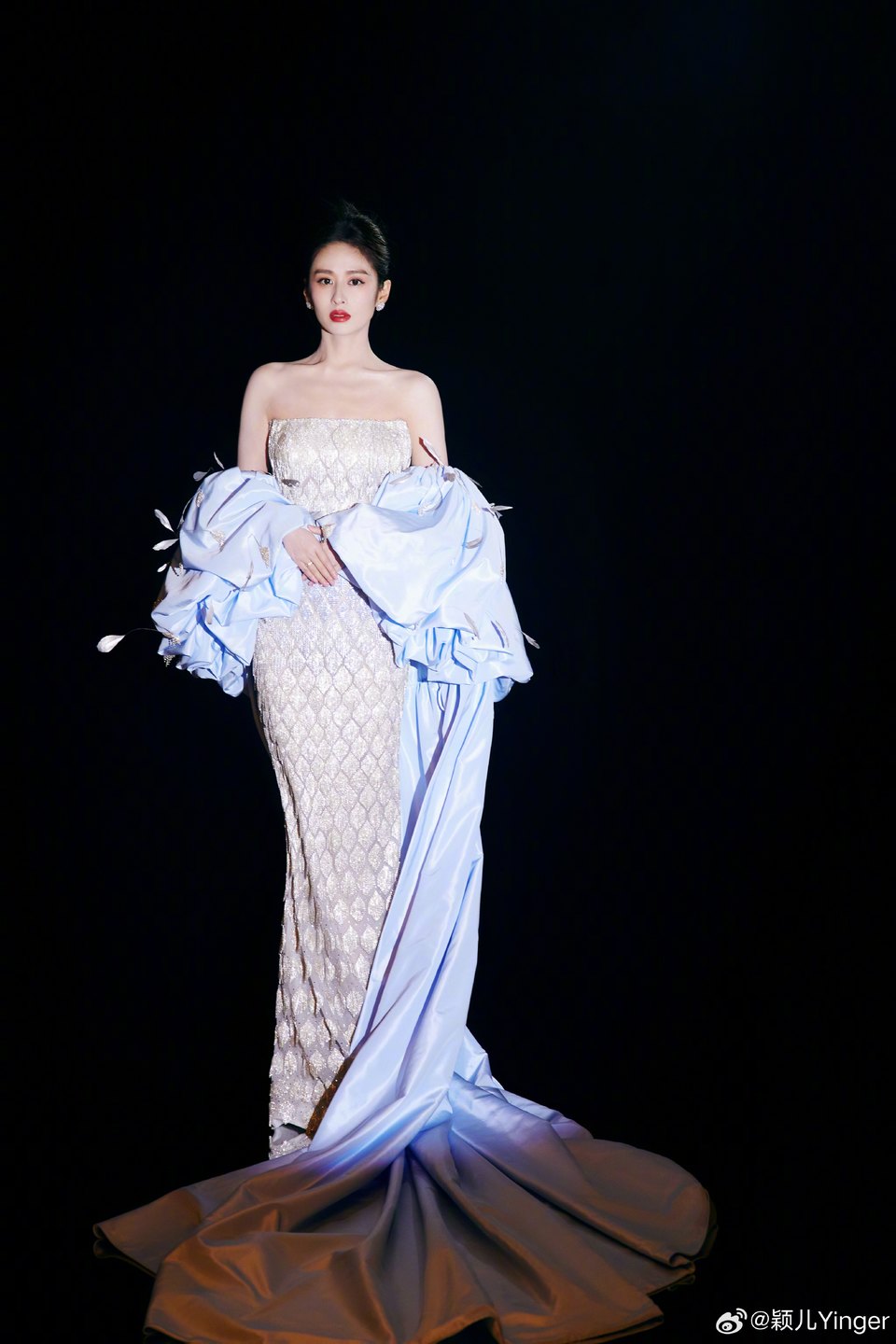 穎兒身著(zhù)修身抹胸閃鉆流蘇裙搭配藍色羽毛拖尾現身