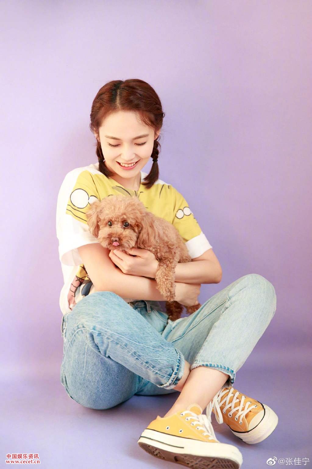 張佳寧與小狗萌寵合照 雙馬尾更顯少女情懷
