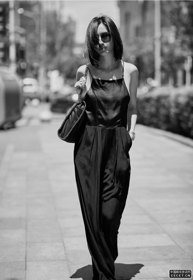 張儷時(shí)尚街拍黑白大片 身著(zhù)一襲吊帶連體褲