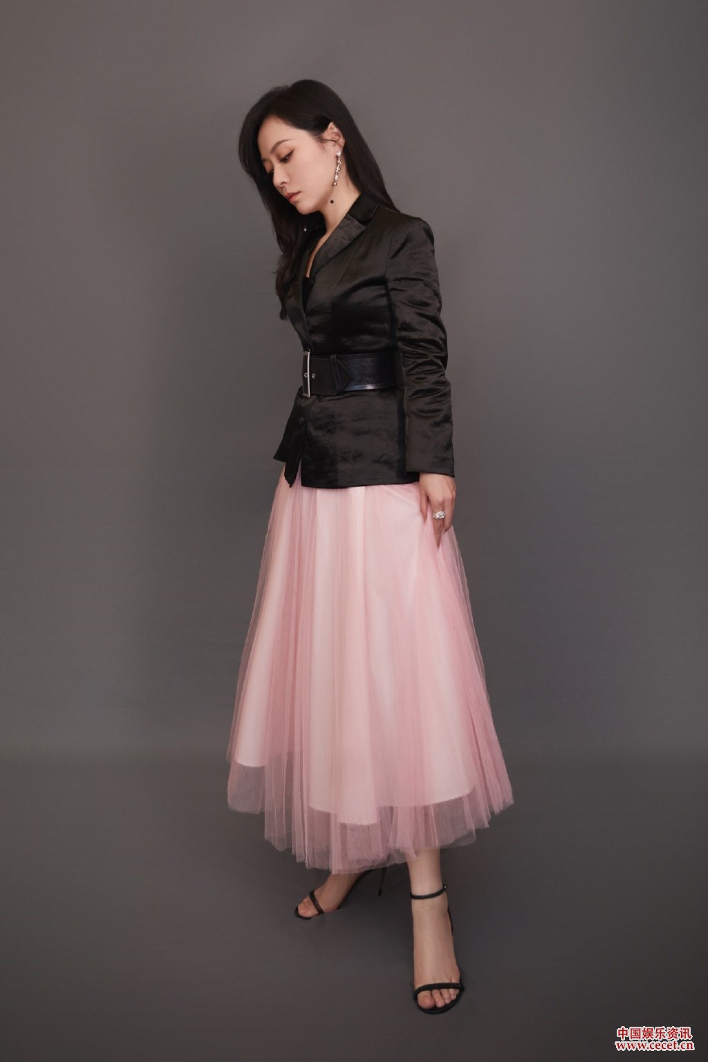 張靚穎黑色外套搭配粉色長(cháng)裙演繹多面魅力
